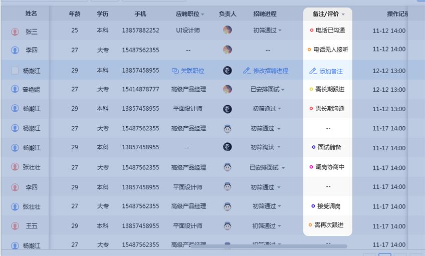 在我们电话邀约的过程,我们除了需要电话沟通外,也要记录沟通过程,便于我们对候选人做二次跟进,对候选人的了解。但你还在用excel做备注吗?这样做,我们更便捷记录候选人情况,需跟进、淘汰、已进入面试等招聘全流程一目了然,对候选人了如指掌: