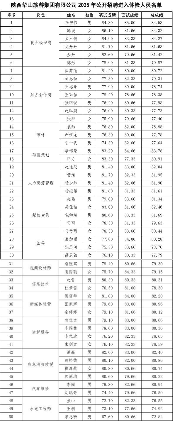 按照《陕西华山旅游集团有限公司2025年招聘业务管理人员和专业技术技能人员的公告》规定,现将面试结果、进入体检人员名单等事项公告如下: