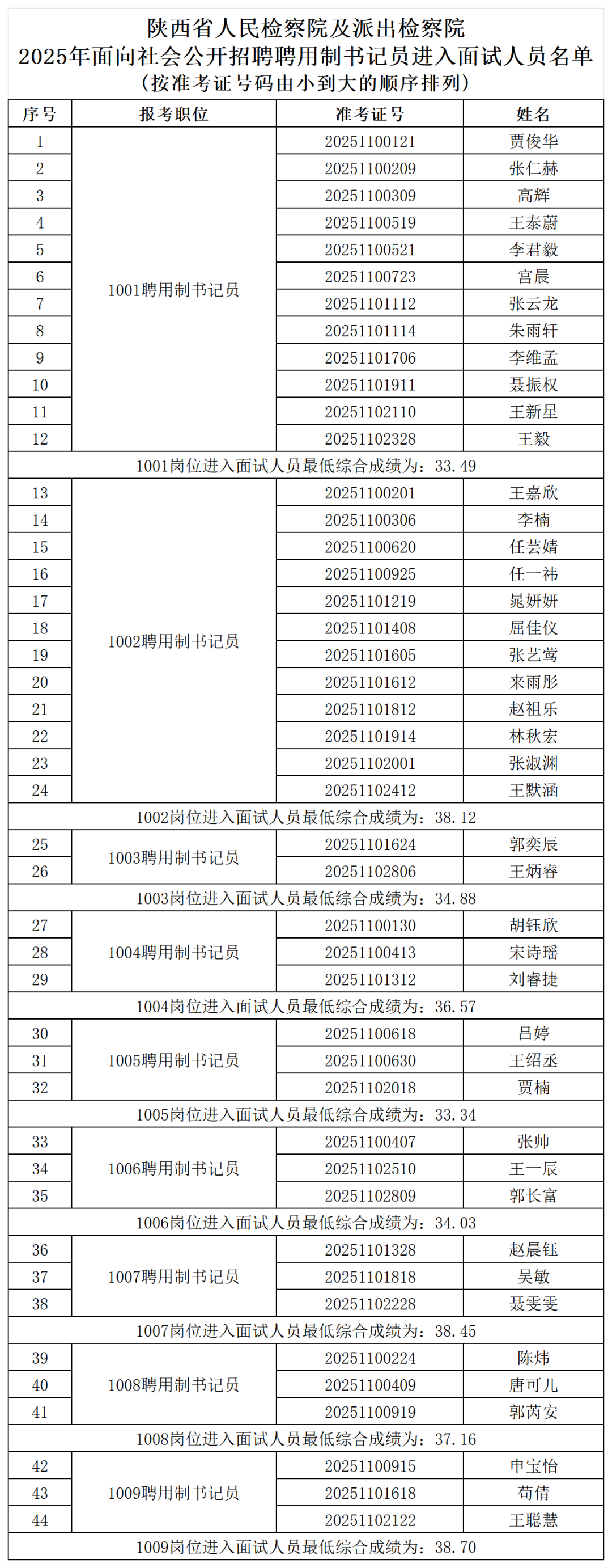 1. 陕西省人民检察院及派出检察院2025年面向社会公开招聘聘用制书记员进入面试人员名单