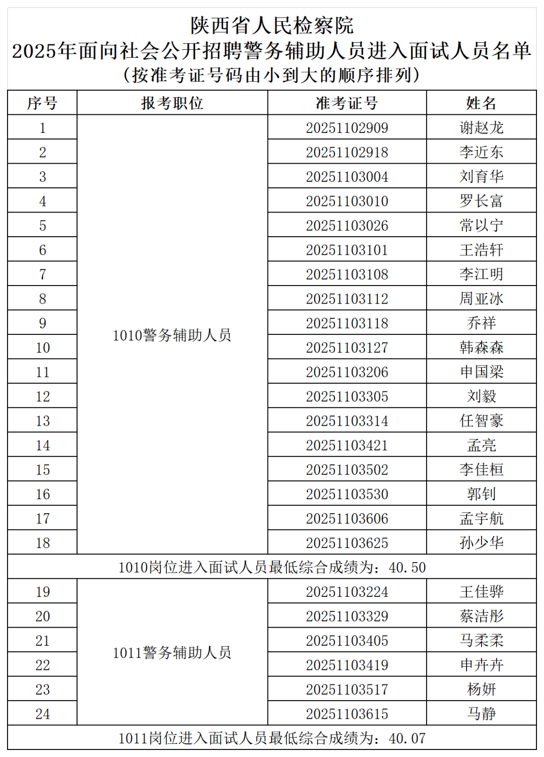 按照《陕西省人民检察院及派出检察院2025年面向社会公开招聘聘用制书记员公告》和《陕西省人民检察院2025年面向社会公开招聘警务辅助人员公告》规定,现将进入面试考生名单及面试工作安排等事项公告如下: